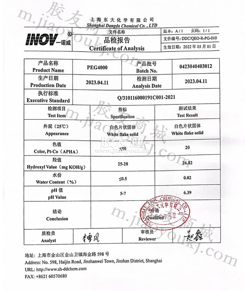 聚乙二醇 4000:是一种乳白色片状固体,化学成份为聚乙二醇,由环氧乙烷聚合而成,CAS 号为 25322-68-3。其分子量为 3400-4200,凝点为 50-54℃,粘度为 5.5-9.0,酸度为 4.0-7.0,pH 值使用范围为 6-7,含量不低于 99%。它无毒、无刺激性,具有良好的水溶性和相溶性,在化妆品、制药、化纤、橡胶、塑料等行业有着广泛应用。